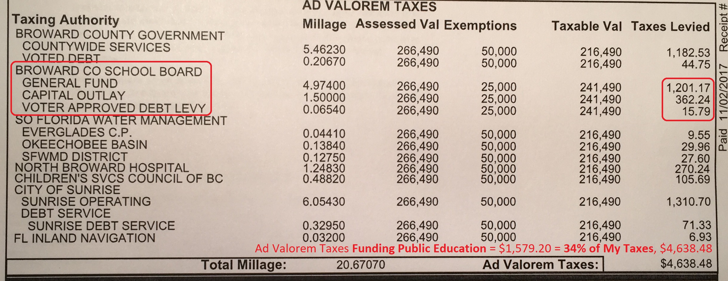 100 years ago, over 80 percent of the funding came from Local Taxes, yes, our Property Taxes. Property Taxes, also called Ad Valorem Taxes (from Latin for “according to the value”) still account for the bulk of public school funding (see my recent Tax Bill from Broward in Florida – Over 34 percent of our Property Taxes funds Broward County Public Schools).